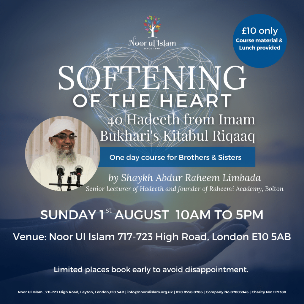 Noor Ul Islam is pleased to announce a one day course by the renown scholar Shaykh Abdur Raheem Limbada on Sunday 1st August.